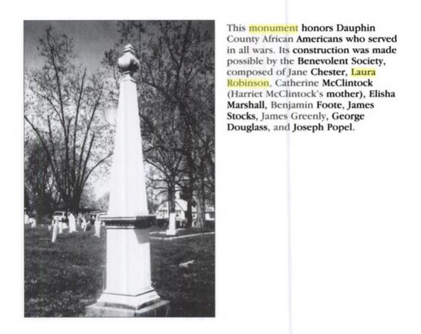 “This monument honors Dauphin County African Americans who served in all wars. Its construction was made possible by the Benevolent Society, composed of Jane Chester, Laura Robinson, Catherine McClintock….” — John W. Scott, African Americans of Harrisburg.