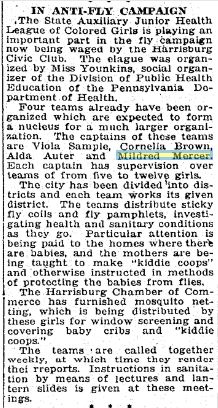 Activism: Team captain of anti-fly campaign, public health event in Harrisburg undertaken by the State Auxiliary Junior Health League of Colored Girls and the Division of Public Health Education of the Pennsylvania Department of Health; served on waitress committee for the Welcome Home supper in Harrisburg for returning soldiers from World War I; active musical contributor as vocal accompanist and pianist at events at the Phyllis Wheatley YWCA and regional churches; involved in Professional Women’s Club at YWCA (delegate for convention at Cheney School for business girls); and “The Negro Achievement Program” on local radio (assistant director).