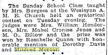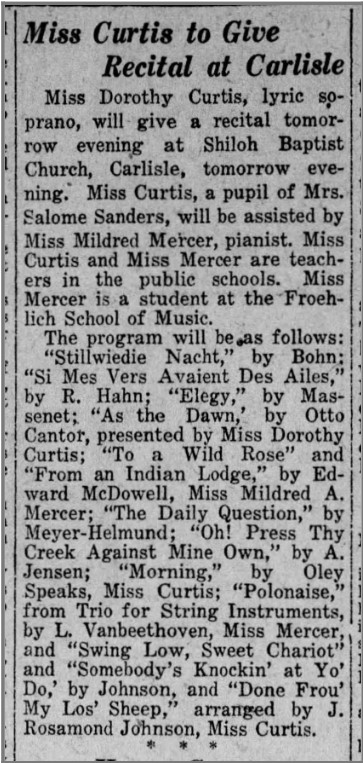 “Miss Dorothy Curtis, lyric soprano, assisted by Miss Mildred Mer- cer, pianist, will present a program at the A.M.E. Church … Both Miss Mercer and Miss Curtis are teachers in the public schools of this city.” — The Evening News, March 29, 1930.