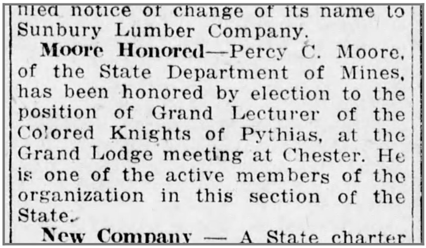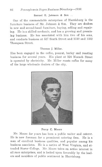 “Mr. Moore takes an active interest in all race enterprises and is looked upon favorably by the leaders and moulders of public sen- timent in Harrisburg.” — Pennsylvania Negro Business Directory 1910.