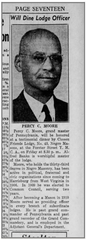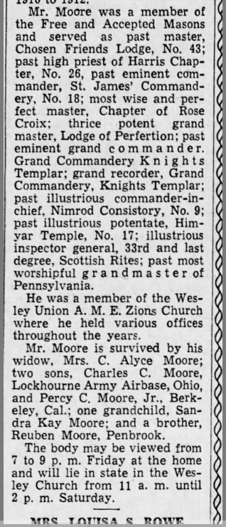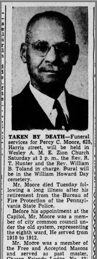 My Legacy: I worked to change the perception of the Eighth Ward to the outward community and worked with the city to make real changes on behalf of our community, including increased police patrol and beautification. I am remembered through the naming of a masonic lodge, Percy C. Moore Lodge 140 in Philadelphia.