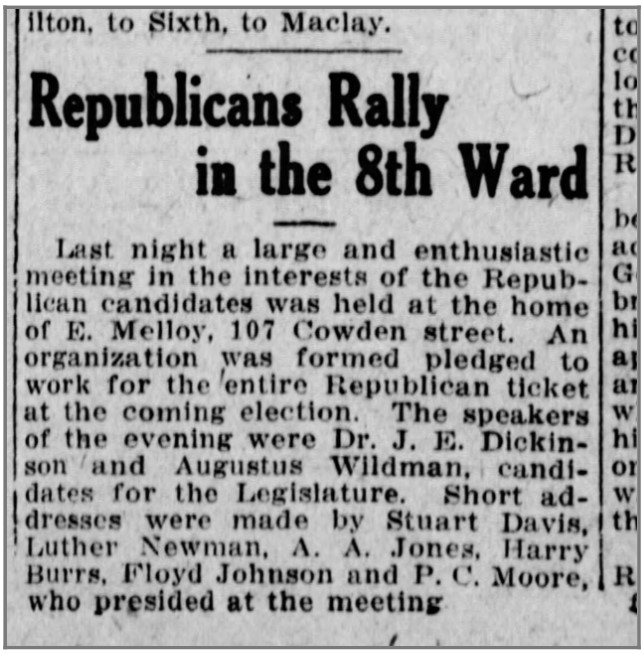 Connection to the Old Eighth Ward: Lived immediately north in the Seventh Ward; represented Eighth Ward as city council member; member of Wesley Union A.M.E. Zion Church.
