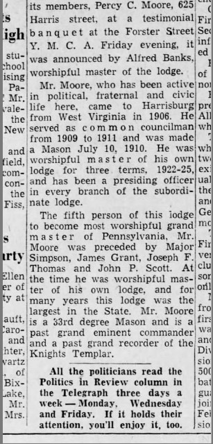 About Me: “Mr. Moore is a gentleman of worth to the community and we are confident that if elected, he will serve the people of his ward acceptably and look out for the interests of the whole city.” — Harrisburg Telegraph, February 14, 1910.