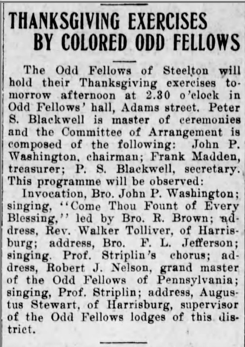Activism: Afro-American Republican League of Pennsylvania (president), Colored Professionals and Businessmen (member), Harrisburg NAACP (secretary), Harrisburg People’s Forum (president), Colored People for Independence (director – Wilmington), Mohican Club in Harrisburg, Colored Elks (member). Sued Victoria theatre over segregation in 1913 and won.