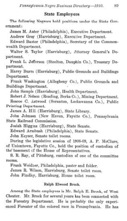 Occupations: Clerk (Mining Department, Harrisburg). Porter. Messenger. State Athletic Commission member. Editor of Advocate-Verdict, Wilmington Advocate, and Washington Eagle. Publisher of Masterpieces of Negro Eloquence. Real Estate Dealer. Assistant Di- rector of Public Safety (Philadelphia). Acting Fire Marshal (Philadelphia).