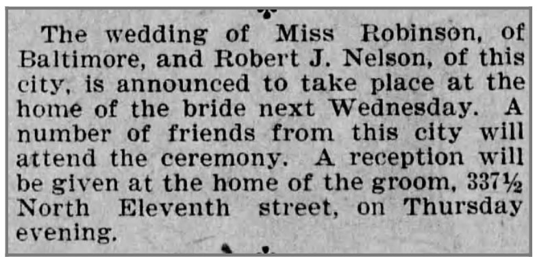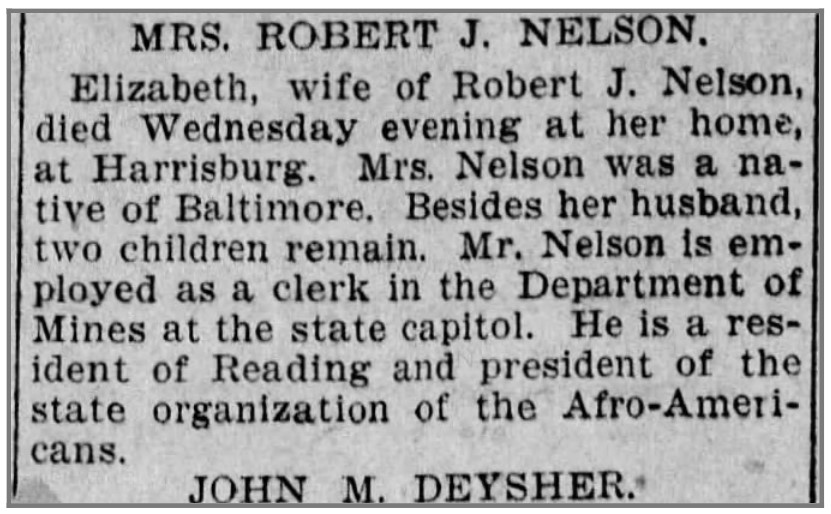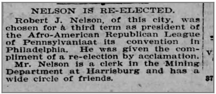 About Me: “Robert J. Nelson, of this city, was chosen for a third term as president of the Afro-American Republican League of Pennsylvania… He was given the compliment of a re-election by acclamation. Mr. Nelson is a clerk in the Mining Department at Harrisburg and has a side circle of friends.” — Reading Times, June 17, 1904.