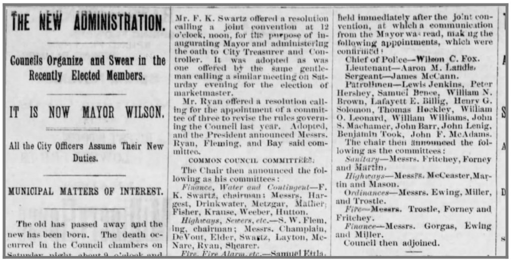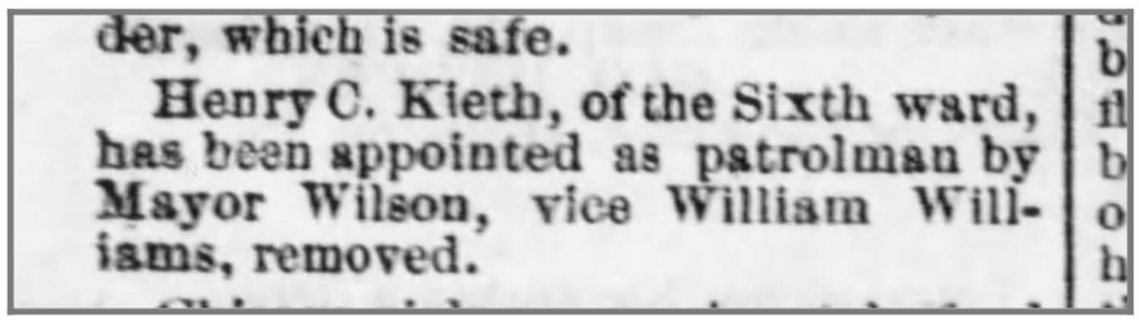 Occupations: City Policeman, appointed in 1883 by Mayor Cameron Wilson. Laborer. Street sweeper. Hod carrier, construction. Contractor, unloading coal boats. Janitor, Calder School building