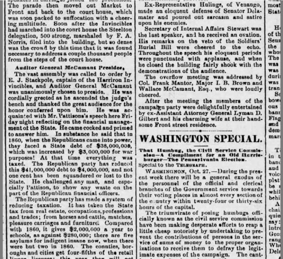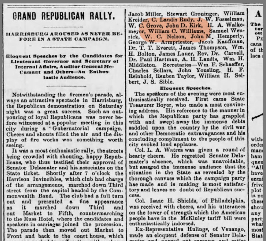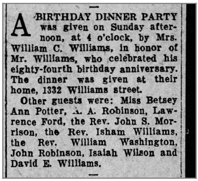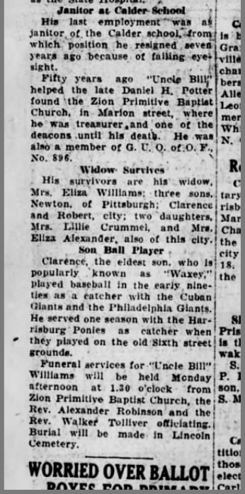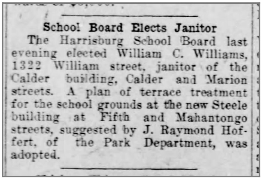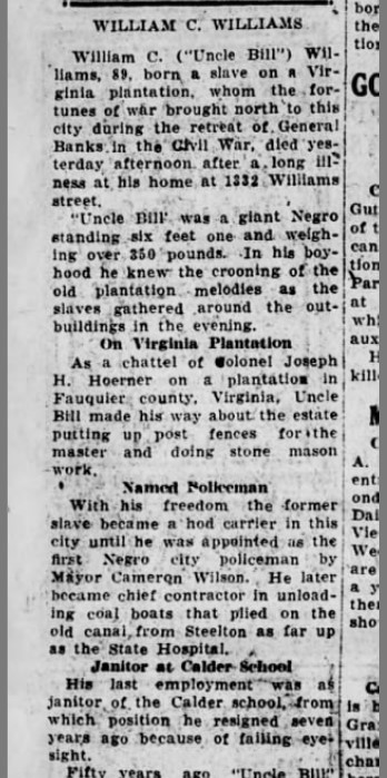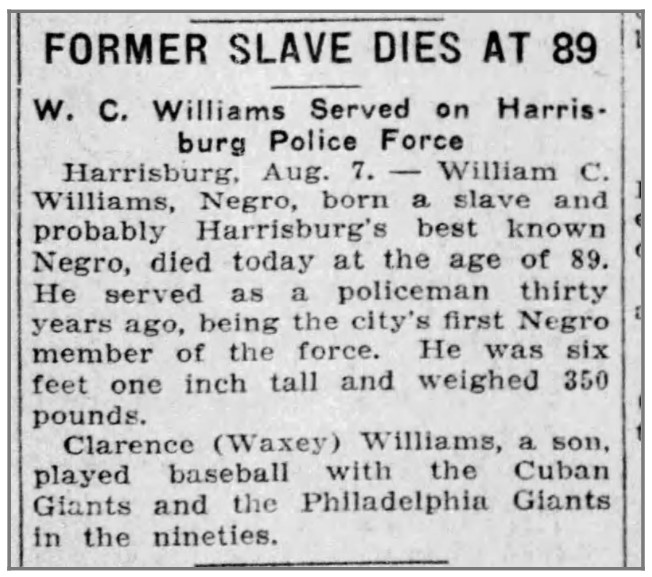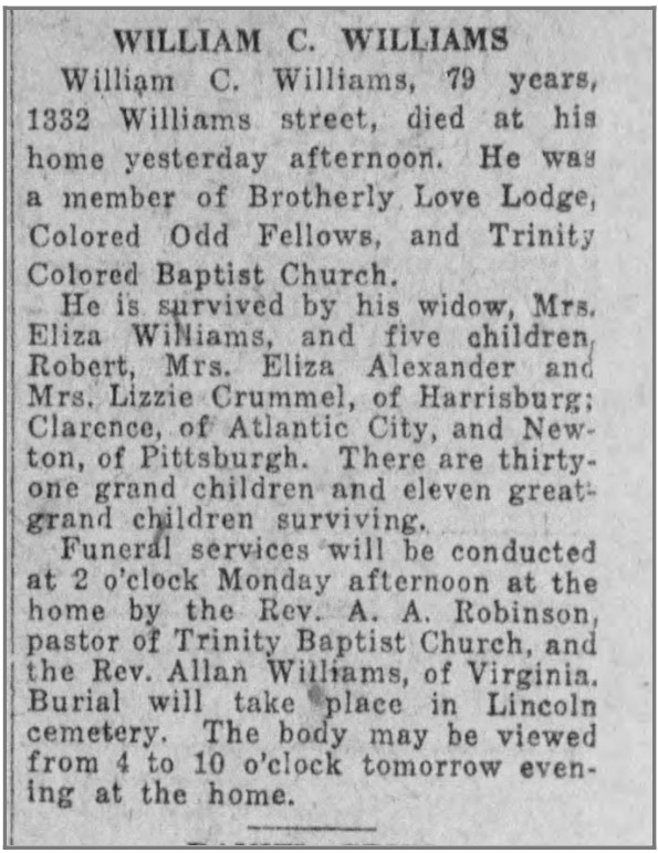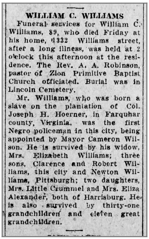 About Me: “William C. (‘Uncle Bill’) Williams, born a slave on a Virginia plantation, whom the fortunes of war brought north to this city during the retreat of General Banks in the Civil War….became a Hod carrier in this city until he was appointed as the first Negro city policeman by Mayer Cameron Wilson. He later became chief contractor in unloading coal boats that plied the canal from Steelton… Fifty years ago ‘Uncle Bill’ helped the late Danie H. Potter found the Zion Primitive Baptist Church” — Harrisburg Telegraph, Aug 6, 1927.