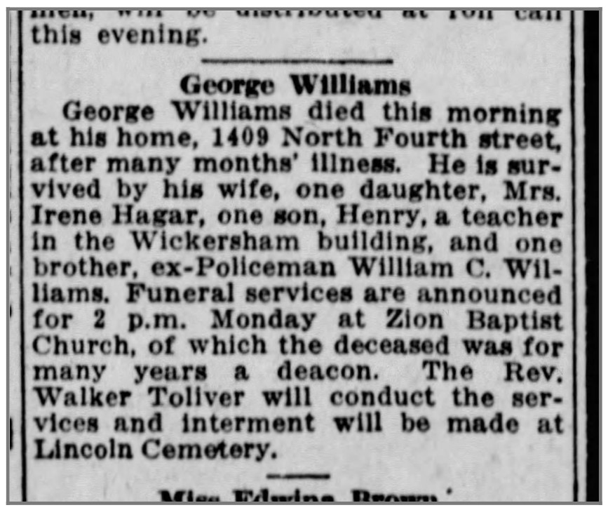 Family Members: Wife: M1: Jennie (Smith) Williams. Wife M2: Elizabeth “Eliza” Trummel Williams, m. 1900-August 5, 1927. Siblings: George Williams. Children: Shelly Williams, James Williams, Elmer Williams, Clara Williams, Mary Williams, Clarence “Waxey” Williams, Robert M. Williams, Newton Williams, Mrs. Lillie Williams Crummel, George Williams, Pear Williams (adopted), Carrie Williams Brown, Mrs. Eliza Williams Alexander, Alverta Woodson (step-son), Lester Woodson (step-son). Grand- children: William D. Williams.