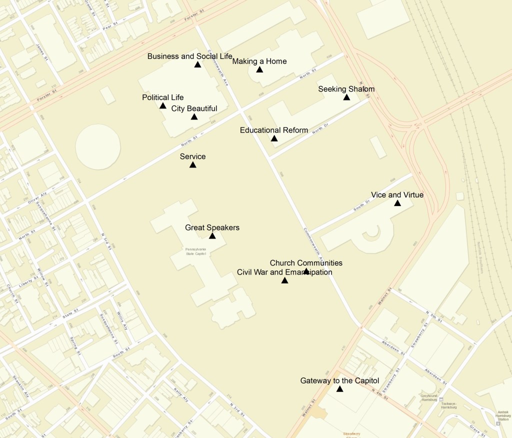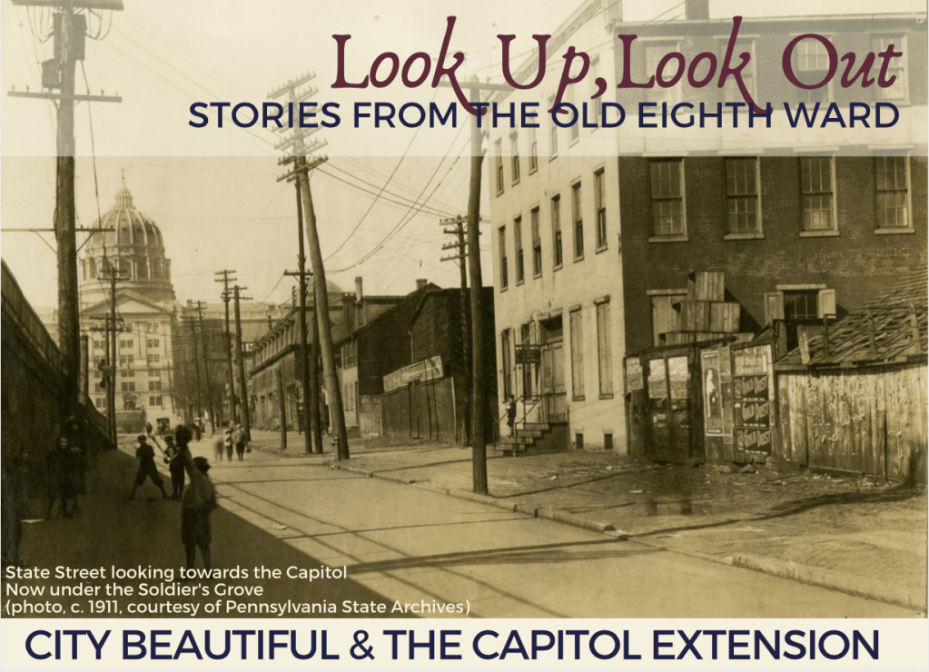 In 2018-2020, the Commonwealth Monument Project chose 12 sites throughout the various buildings of the Capitol Complex to place posters that tell the varied stories of the Old Eighth Ward. We invite visitors to Pennsylvania’s capitol district to stop, look up, look out, and imagine a thriving neighborhood that once existed before the Commonwealth of Pennsylvania appropriated the grounds a century ago for state use.