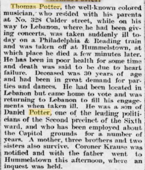 About Me: “Daniel Potter, one of the leading politicians of the Second precinct of the Sixth ward, and who has been employed about the Capitol grounds for a number of years.” Harrisburg Telegraph, November 9, 1899.