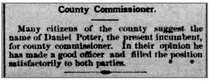 Family Members: Siblings: George Potter, Richard Potter, Matilda Potter Puller. Wife: Betsy Ann (Smith) Potter of Berryville, Virginia. Children: Charles Potter, Elizabeth Potter, Richard Potter, Daniel G. Potter, Jr., George L. Potter, Layton Potter, Elizabeth “Bessie” M. Potter, and Thomas Potter.