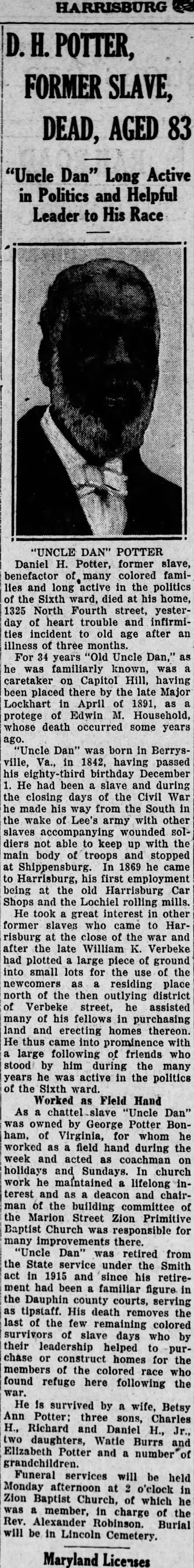 “‘Uncle Dan’, long active in politics and helpful leader to his race.” Article, Harrisburg Telegraph, December 12, 1925.