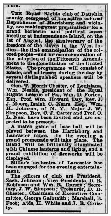 My Contribution: I co-founded the Brotherly Love Lodge, Grand United Order of Odd Fellows in Harrisburg. I was so politically influential that I even ran as an independent candidate for Harrisburg Mayor in 1872. In Philadelphia, I was the first person of color elected to the Common Council. I also played for the Harrisburg Monrovian baseball team in 1867 against the Philadelphia Pythians (whose roster included Octavius Catto).