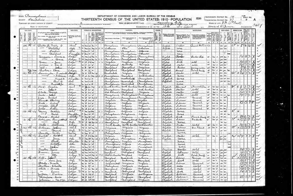 Places of Residence: Harrisburg, Pennsylvania: 127 Short Street, 250 Liberty Street, and 133 Balm Street.