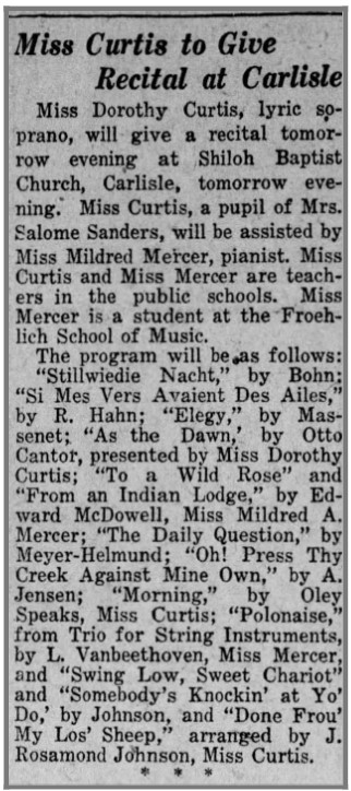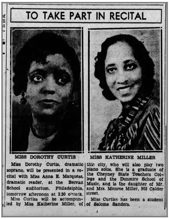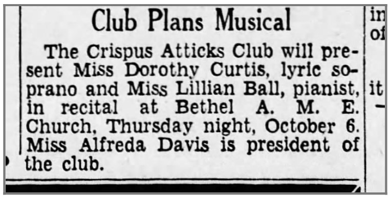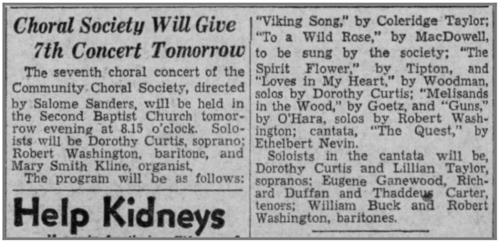 Activism: Community Choral Society; Alpha Music Study Club (Harrisburg branch of National Association of Negro Musicians); Crispus Atticks Club.