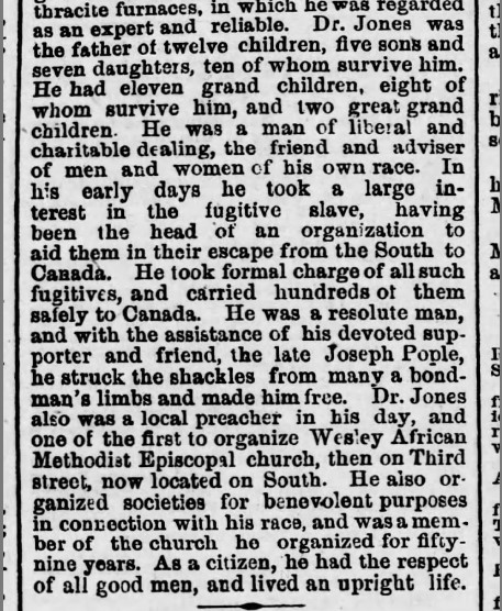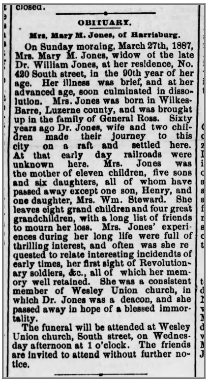 Full Name: William M. Jones. Nickname: “Pap” • Birth Date: 1791 (Harrisburg Telegraph, August 3, 1881) or 1793 • Death Date: August 1, 1881 • Place of Birth: Kingston, Luzerne County, Pennsylvania • Sex: Male • Race: Black (1870 Federal Census) • Places of Residence: Wilkes Barre, Pennsylvania. Harrisburg: 422 South Street, 432 South Street. • Connection to the Old Eighth Ward: Resident. Dedicated church member of Wesley Union A.M.E. Zion Church. Partnered with others in the neighborhood to create a network of allies and secure safe passage on the Underground Railroad. • Family Members: Wife: Mary Jones. Children: Mary Jones, Henry Jones, David Jones, Margaret Jones, Charles Jones, Juliann Jones, Mrs. William Steward. • Education: Trained as a druggist with Mr. Calendar and Dr. D.W. Gross (Harrisburg Telegraph, August 3, 1881). • Occupations: Pharmacist. Medical Doctor. Laborer/ molder in a foundry. Preacher and organizer. • Church Membership: Wesley Union A.M.E. Zion Church. • Activism: Wesley Union A.M.E. Church (deacon); social activist and organizer of benevolent societies for the African American community; found- ed Black cemetery (Harrisburg Daily Independent, March 31, 1883). • Connections: Fellow activists and transporters in the Underground Railroad: Harriet McClintock Marshall, Joseph Cassey Bustill, Jane Chester, and Mary Bennett.