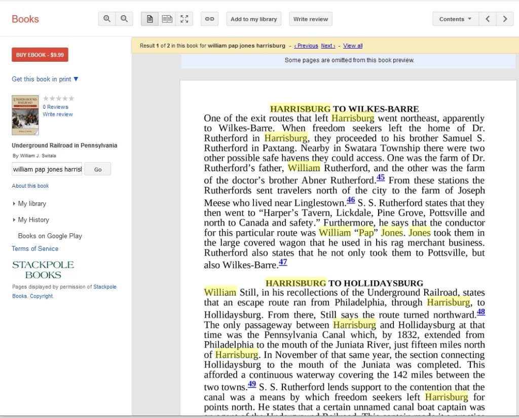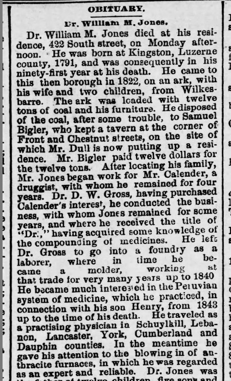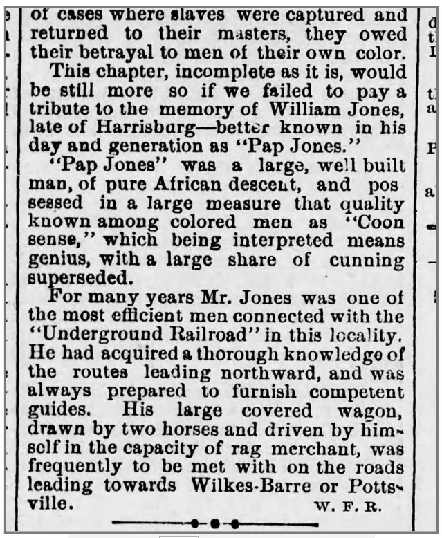 About Me: “‘Pap Jones’ was a large, well-built man. For many years, Mr. Jones was one of the most efficient men connected with the ‘Underground Railroad’ in this locality. He had acquired a thorough knowledge of the routes leading northward and was always prepared to furnish competent guides. His large covered wagon drawn by two horses and driven by himself in the capacity of rag merchant was frequently to be met with on the roads leading towards Wilkes-Barre or Pottsville.” — Harrisburg Telegraph, January 29, 1887.