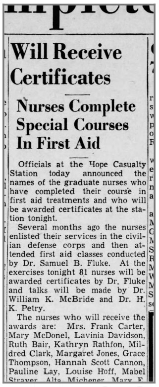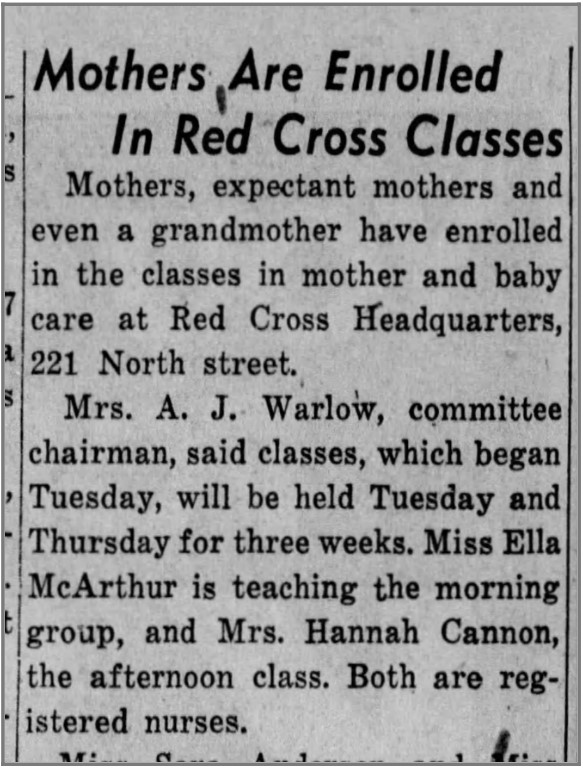 Occupations: Registered Nurse. State Nurse. Instructor of Red Cross home nursing classes for mothers/expectant mothers and home care of the sick. Visiting Nurses’ Association. Mother.