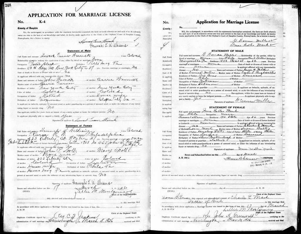 Places of Residence: 1637 Titan Street, Philadelphia, Pennsylvania (1900); 360 Canal Road, Susquehanna Township, Dauphin County (1910); Washington, D.C.; St. Louis Missouri; 112 Edgecombe Ave, New York City, New York (1930); 232 Liberty Street (1925, 1940-1955) and 233 Liberty Street (1926), Harrisburg, Pennsylvania.