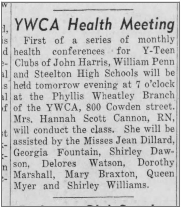 About Me: “At a planning conference at the Phyllis Wheatley YWCA recently… Mrs. Hannah Scott Cannon pointed out the need for greater knowledge in safety, sanitation and disease.” The Evening News, October 13, 1945.