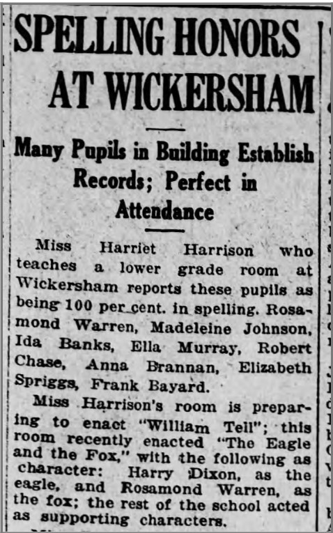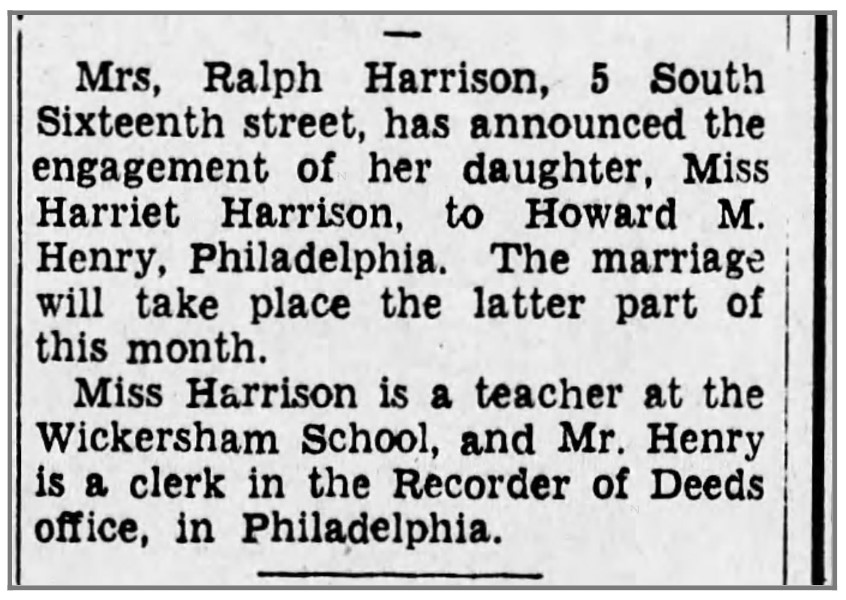 About Me: “Miss Harriett Harrison, a school friend of the bride [Catherine Payne] was maid of honor, wearing a beautiful gown of white crepe de chine with lace and crystal trimmings.” — Harrisburg Telegraph, November 21, 1912.