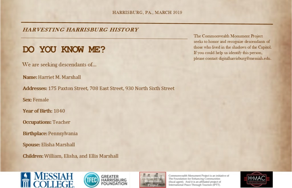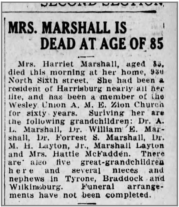 About Me: “She had been a resident of Harrisburg nearly all her life and has been a member of Wesley Union A.M.E Zion for sixty years.” Harrisburg Telegraph, July 25, 1925.