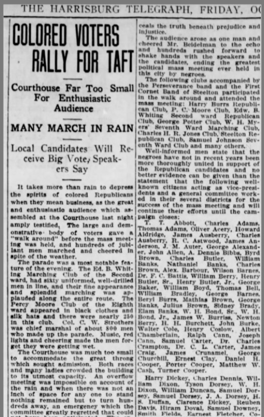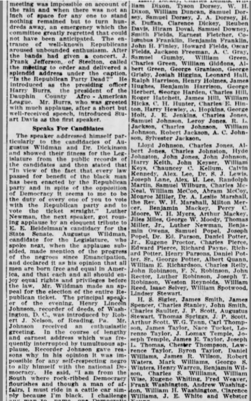 My Legacy: I was an essential worker for the State Capitol. My role as a messenger made me a trusted member of state operations while my activism and engagement in my community made me a leader of advocacy and political work during my time. My work as a political advocate and active leader in the Sixth Ward united Black Harrisburgers and cultivated a sense of resilience amid the community despite the ongoing displacement of many African Americans in Harrisburg due to the Capitol Extension Project. I was recognized as an outstanding leader even in my own day in the Pennsylvania Negro Business Directory published in 1910.