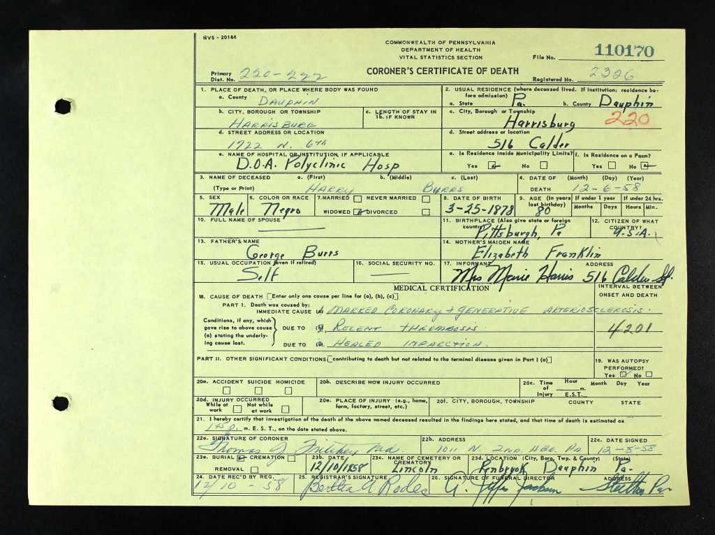 Places of Residence: Harrisburg, Pennsylvania: 1430 Marion Street (1900), 130 Fulton Street (1910), 1407 Marion Street (1917-1930), and 516 Calder Street (1940-1958)