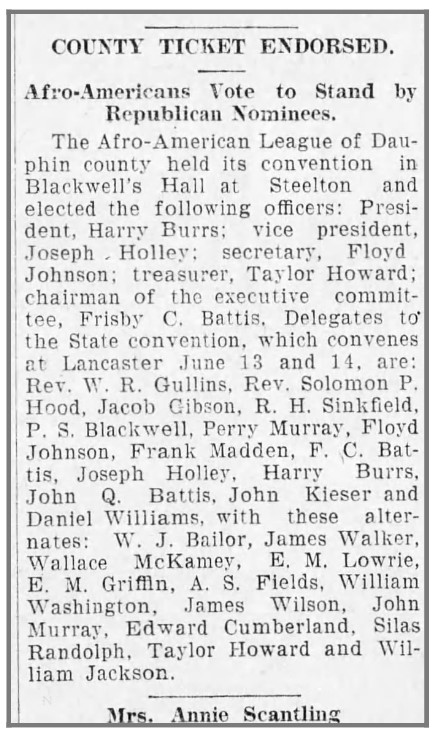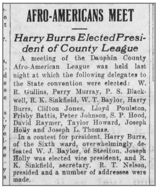 Activism: Dauphin County Afro-American League (President); Unity Lodge No. 71, Colored Elks (Exalted Ruler, treasurer, district deputy for Central Pennsylvania); Elliott Association for Colored Grads of Harrisburg High Schools (organizer and president, 1901-1910); Sixth Ward Social Club (host); Sixth Ward Casino Baseball Team (manager); and Lincoln Cemetery Decoration Day (orator, 1899).