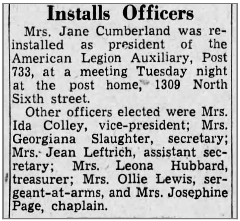 Activism: Elliott Association, American Legion Auxiliary (vice president); Wickersham Teachers’ Association (president).