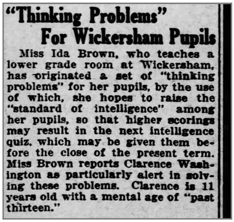 About Me: “Miss Ida Brown, who teaches a lower grade room at Wickersham, has originated a set of ‘thinking problems’ for her pupils, by the use of which, she hopes to raise the ‘standard of intelligence’.” Harrisburg Telegraph, February 25, 1922.