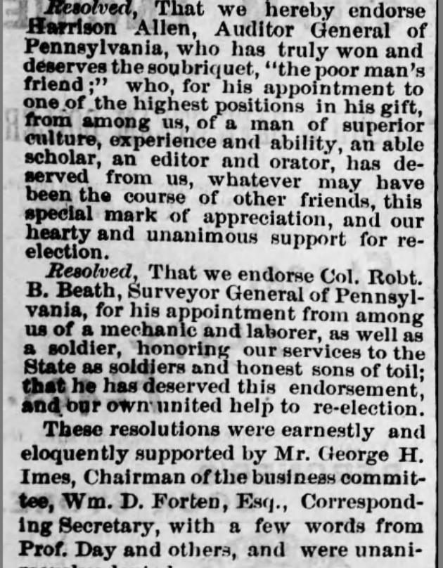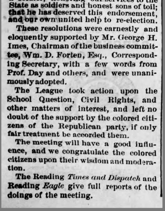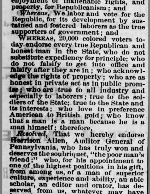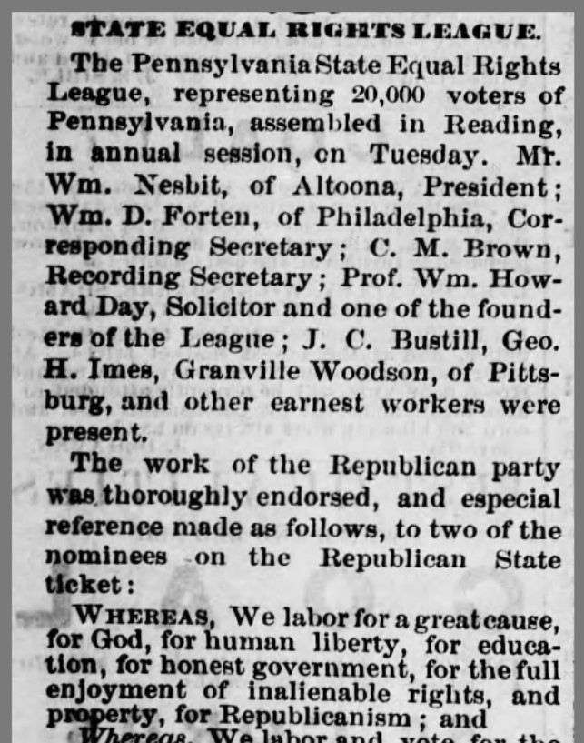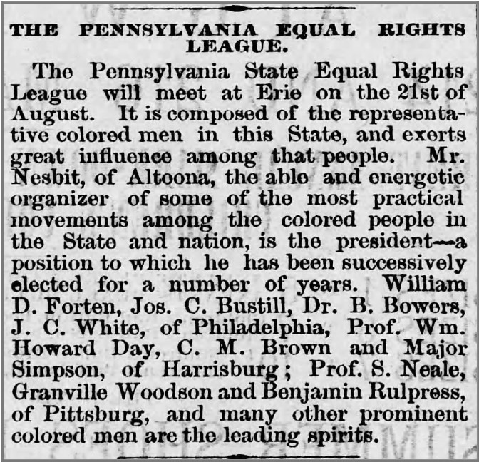Activism: Harrisburg Fugitive Aid Society (co-founder); Grand United Order of Odd Fellows (Grand Treasurer, Most Venerable Patriarch, committee speaker); Household of Ruth in the Grand United Order of Odd Fellows (founder); Pennsylvania Equal Rights League (leader of Philadelphia delegates); Fourteenth Amendment protest convention (presenter); American Moral Reform Society (member); Philadelphia Union League (Fifteenth Amendment parade chairman); Banneker Institute (trustee); and Montana Agricultural Emigrant Aid Association (co-founder).