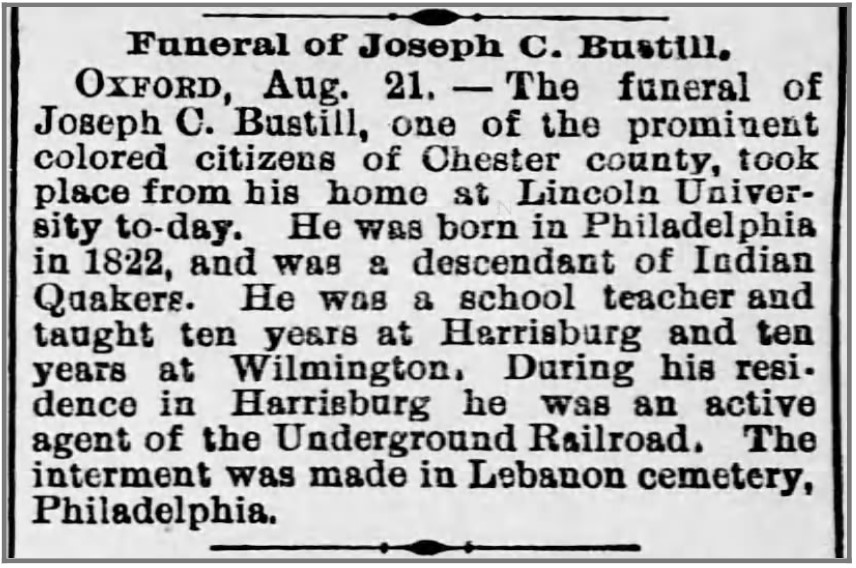 Family Members: Father: David Bustill. Mother: Elizabeth Hicks Bustill. Wife: Sarah Humphrey Bustill. Daughter: Anna Amelia Bustill-Smith.