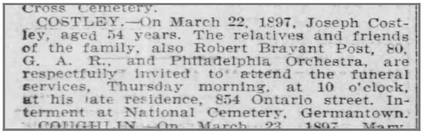 Death Date: March 22, 1897. Buried in Philadelphia.