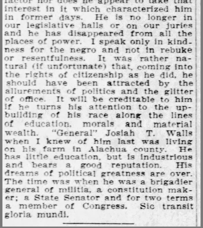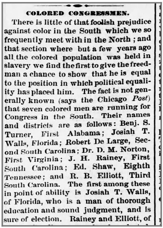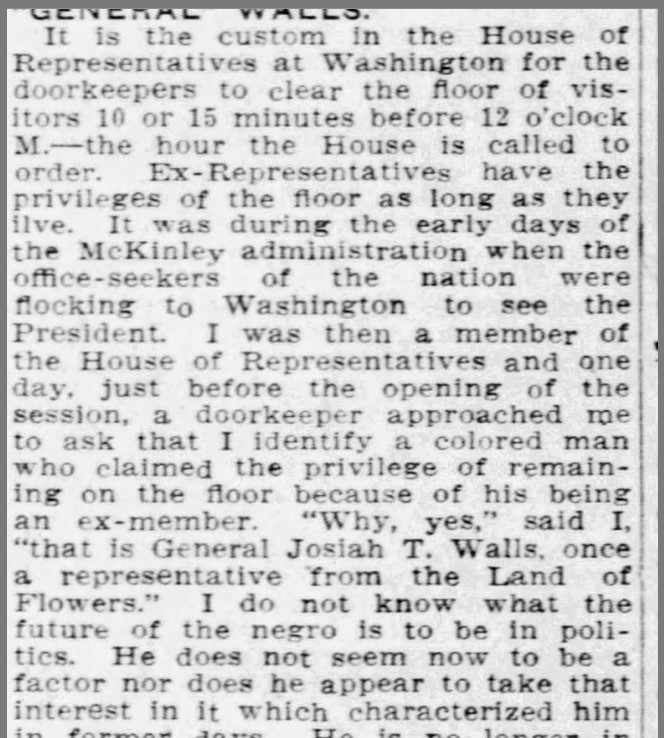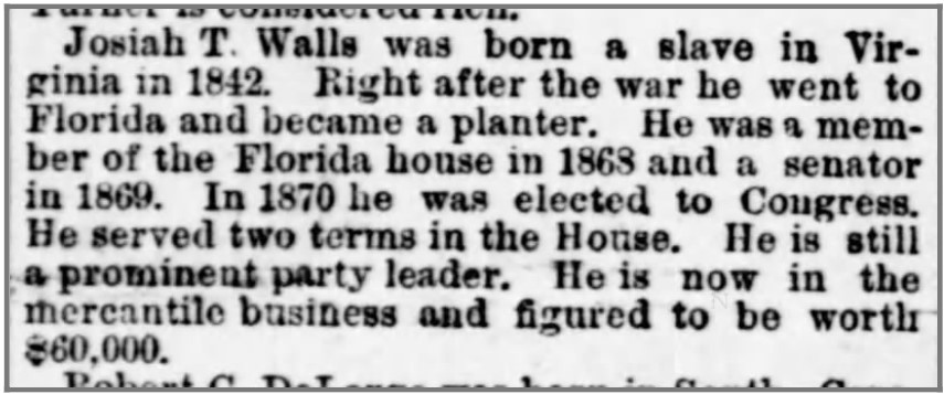 About Me: “Walls spent much of the 42nd and 43rd Congresses advancing the political and economic interests of his Florida constituents. Even Jacksonville’s Democratic Florida Union praised Walls’ efforts on behalf of the state, declaring ‘Mr. Walls adds his mite to what has gone before and does it well.’ He affectionately referred to Florida as “my own sunny state,” in an attempt to promote the potential of his new home for tourism and farming. Walls presented resolutions for statewide internal improvements including the construction of telegraph lines, customhouses, courthouses, and post offices. He sought funding to improve Florida’s harbors and rivers and to create a land-grant state agricultural college. In an 1872 tariff bill, Walls also fought to protect Florida’s orchards from foreign competition.” US House of Representatives: History, Art, and Archives, Biography on Josiah Walls.