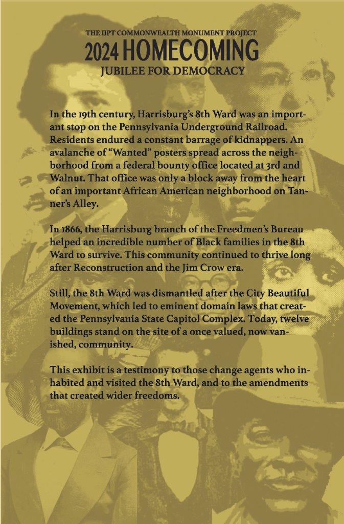 At the start of 2024, legislative leaders, civic organizers, and corporate sponsors gathered to launch the 2024 Homecoming Jubilee for Democracy in Central Pennsylvania. We are inviting the descendants of the Old Eighth Ward to return for a series of reunions that will be held between Memorial Day 2024 and Juneteenth 2025.