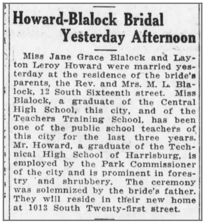 About Me: “Mr. Howard”, a graduate of the Technical High School of Harrisburg, is employed by the Park Commissioner of the city and is prominent in forestry and in shrubbery.” — “Howard-Blalock Bridal Yesterday Afternoon,” Harrisburg Telegraph, June 22, 1918.