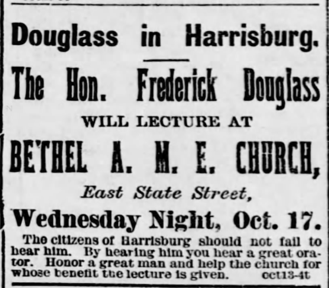 One of the most famous speakers to come to the Old 8th Ward was abolitionist Frederick Douglass. He traveled to the city of Harrisburg multiple times between 1846 and 1895. According to the Harrisburg Telegraph, in 1895, he first came as,