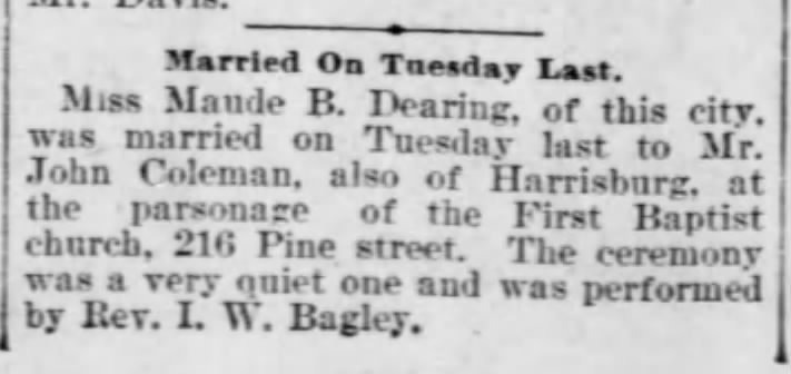 Family Members: Husband: John W. Coleman (Feb 25, 1865-Feb 28, 1948), m. September 3, 1897. Child: Priscilla Coleman, died in infancy.