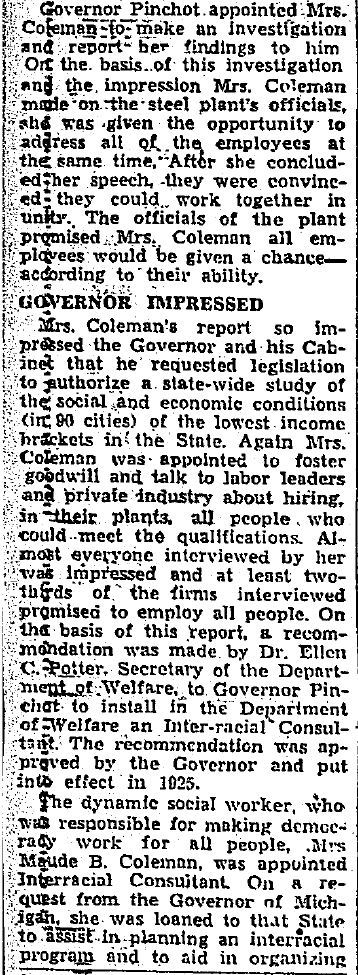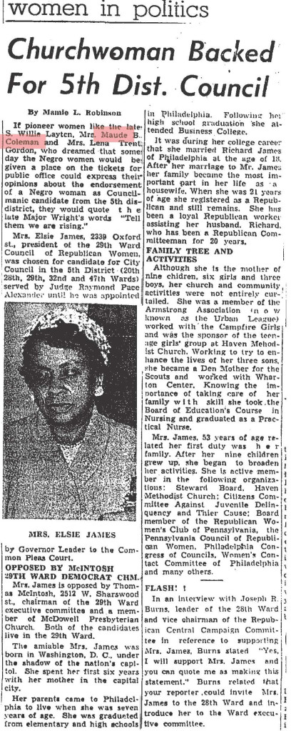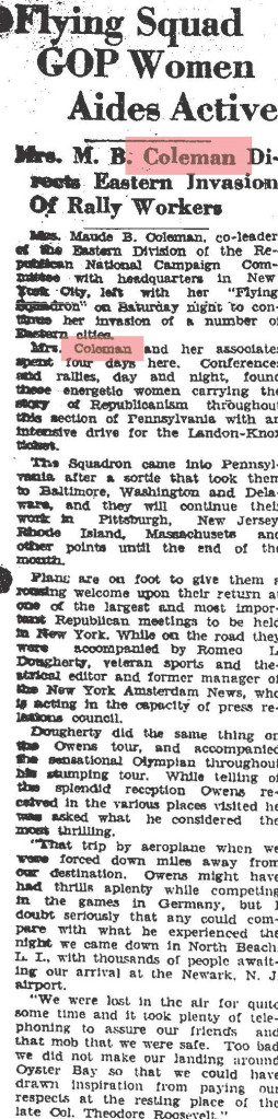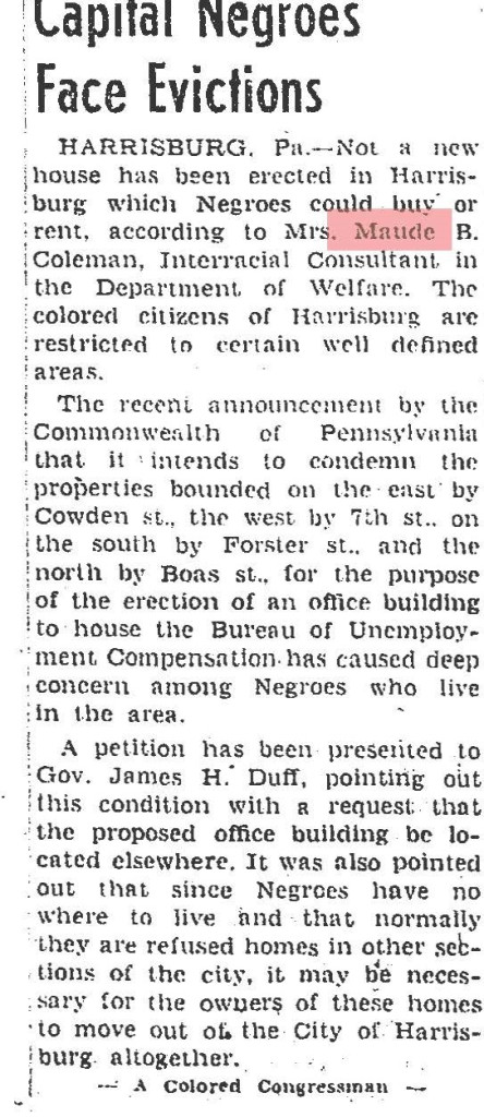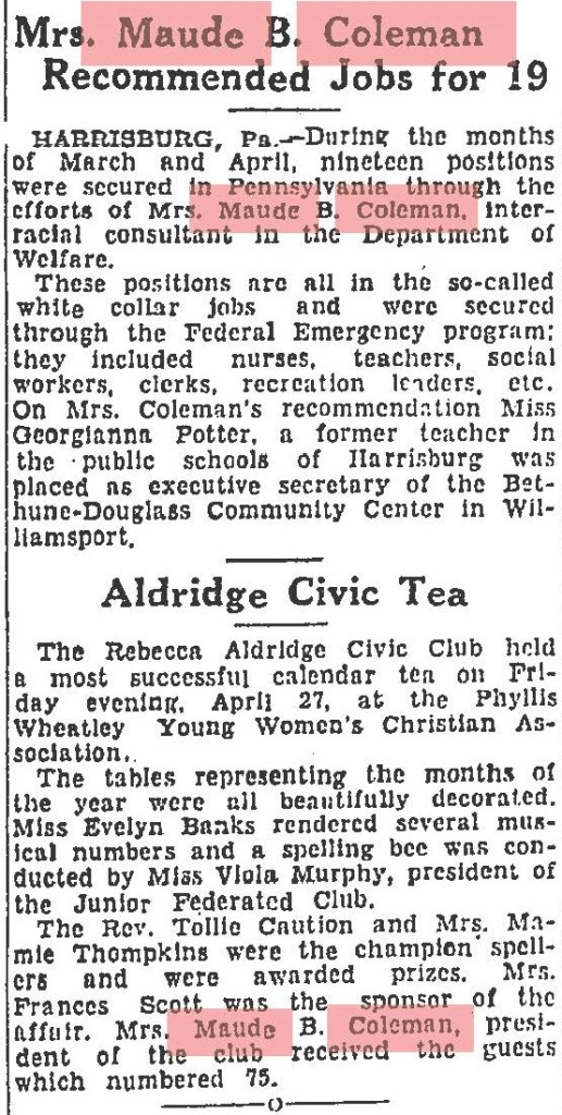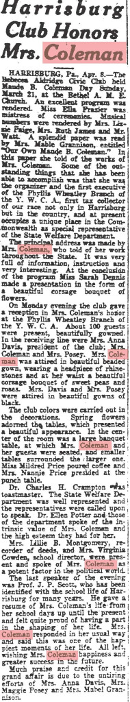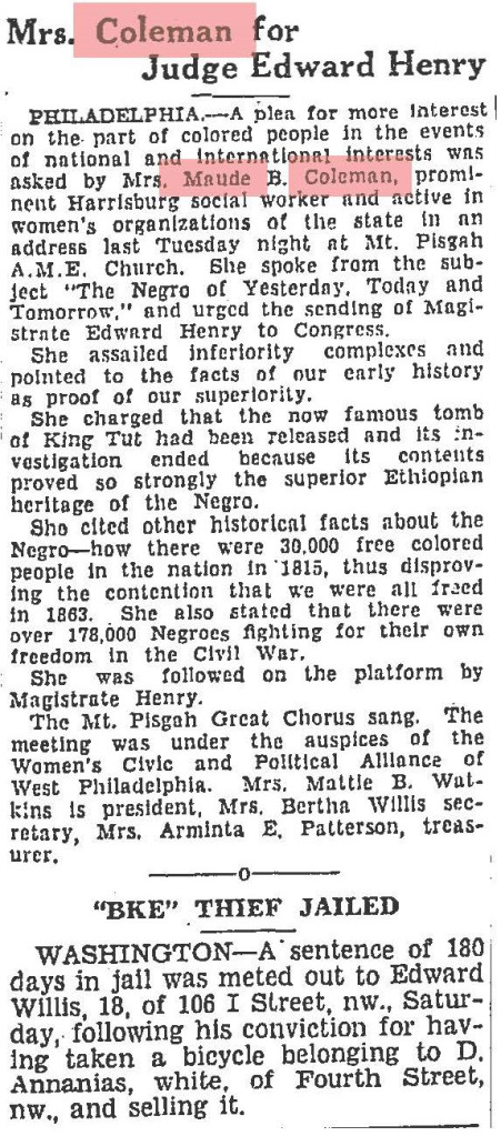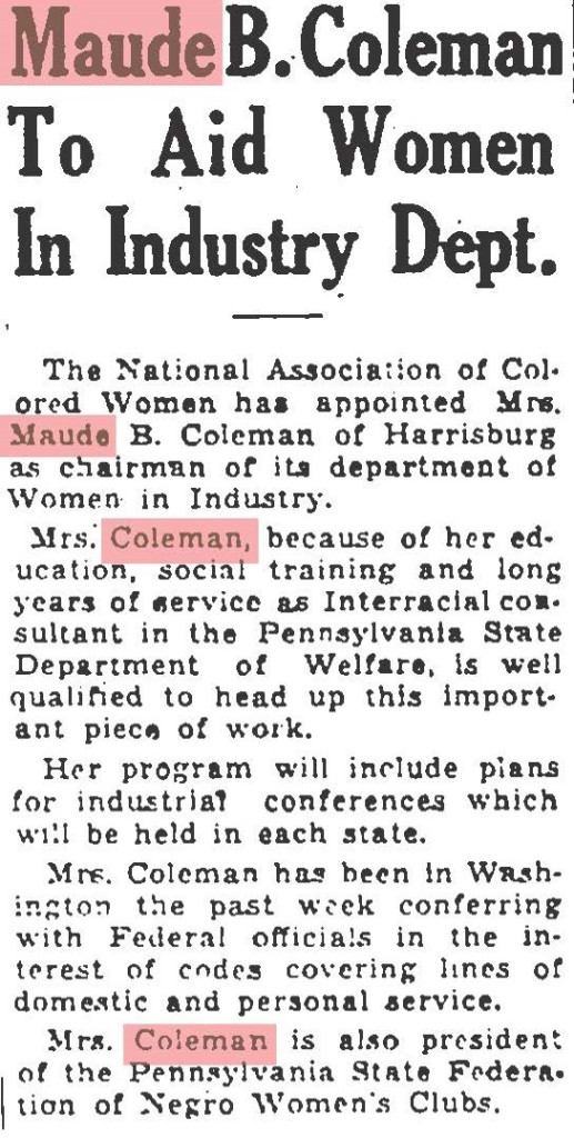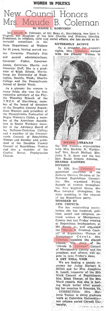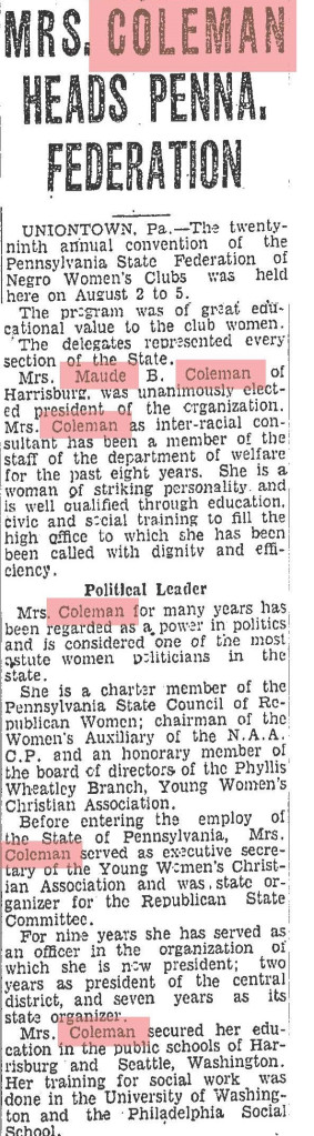 About Me: “Maude Coleman is a woman thoroughly equipped along political lines, having engaged in political, social service, and Y.W.C.A. work…” Harrisburg Telegraph, 1920.