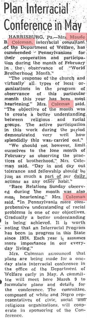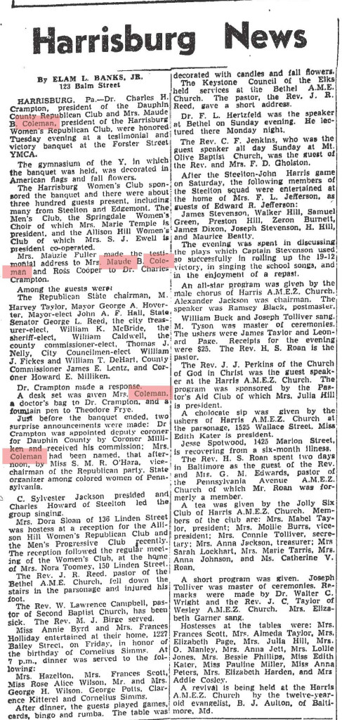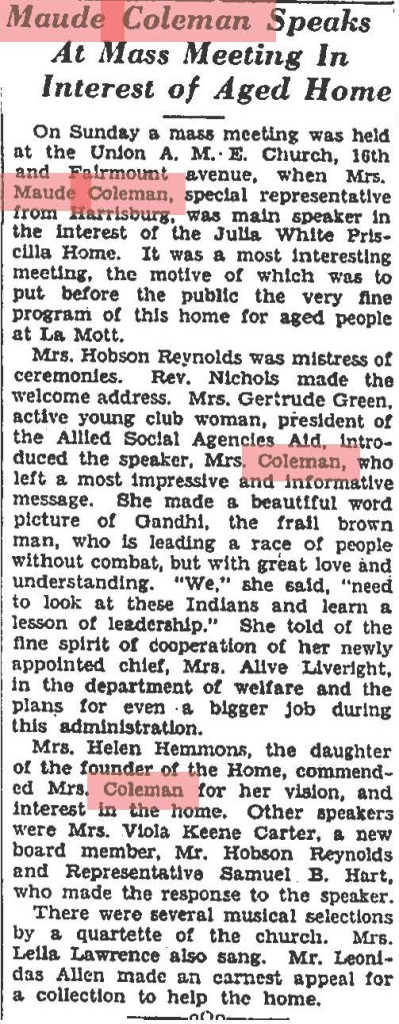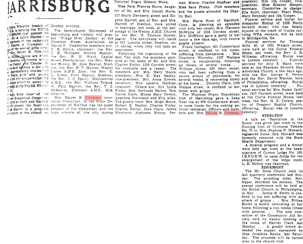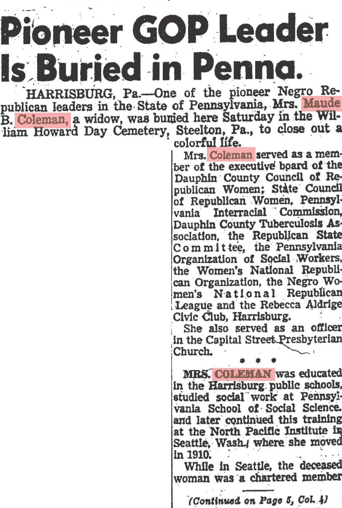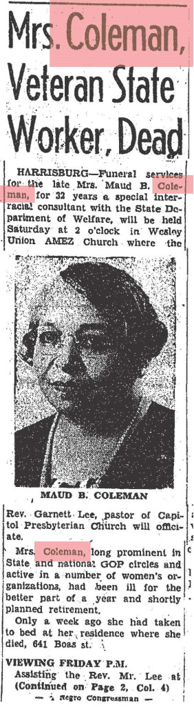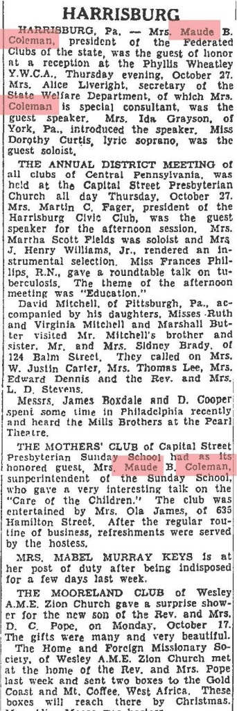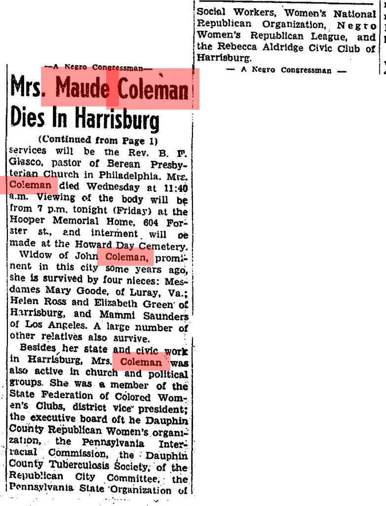 Church Membership: Married at First Baptist Church in Harrisburg; honored with “Maude B. Coleman Day” at Bethel A.M.E. Church in 1926; husband John Coleman was member of Capital Presbyterian Church; Superintendent of Sunday School at Capital Presbyterian; funeral service held at Wesley Union A.M.E. Zion Church with Rev. Garrett Lee (Capital Presbyterian) and Rev. B.T. Glasco (Berean Presbyterian, Philadelphia) officiating. Buried at William Howard Day Cemetery alongside husband.