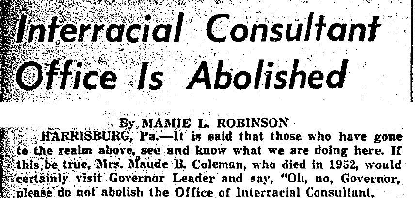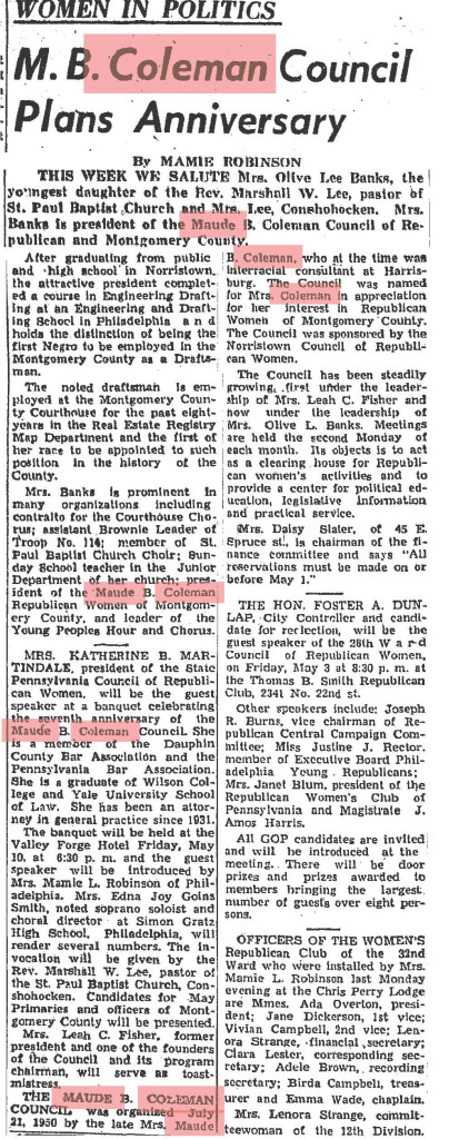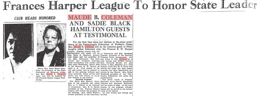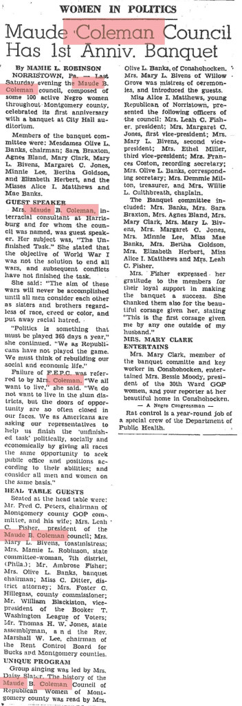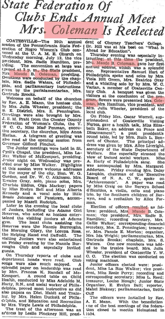 My Legacy: I advocated for the rights of women of color and committed my life to the activist work of interracial reconciliations that still continues today. I was honored by the Francis Harper Club in Harrisburg in 1926. Several organizations named their groups with my name including the Maude Coleman council, the Maude B. Coleman Republican Women of Montgomery County Council, and a community center in Easton Pennsylvania.