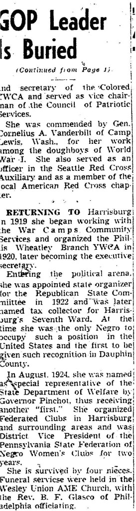 Activism: Dauphin County Organizer of Colored Women; member of Republican City Committee, American Red Cross, Seattle Red Cross Auxiliary, and the Rebecca Aldridge Civic Club of Harrisburg; guest speaker in Harrisburg schools during “National Negro History Week” in 1940; president of the Auxiliary to Harrisburg’s branch of the NAACP; State Organizer of Colored Women by the State Committee of Pennsylvania (Republican appointee); State Federation of Colored Women’s Clubs (district vice president); Pennsylvania State Organization of Social Workers (member, teacher); member of Women’s National Republican Organization and the Negro Women’s Republican League; Bethune-Cookman College in Florida (advisory board); and Colored Women’s Eastern Division of the Republican Party (director).