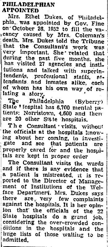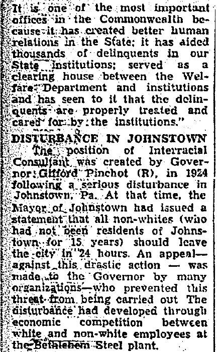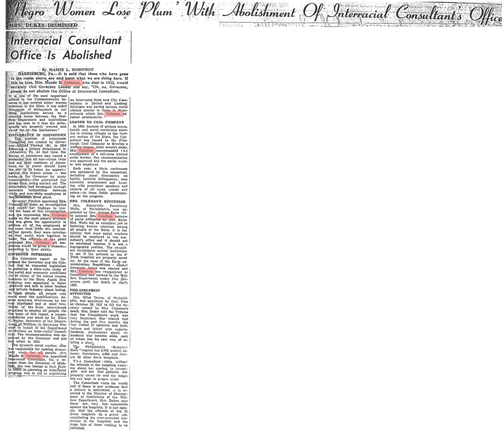 Occupations: Special Inter-Racial Consultant for the State Welfare Department for thirty years. Founding member of the Phyllis Wheatley Colored Harrisburg Branch of the YWCA in 1920. First African American tax collector in the country, according to a Pittsburg Courier article in 1926. Sole “female delinquent tax collector” in Pennsylvania (Chicago Defender, 1935).