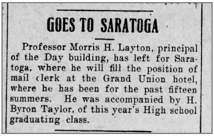 Occupations: Supervisory principal of Lincoln School. Teacher of night school, Lincoln building. Supervisory principal of the William Howard Day building. Teacher of sixth grade. Wickersham building Mail clerk. Grand Union hotel, Saratoga, New York (over 15 summers).