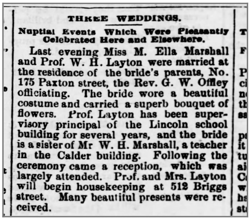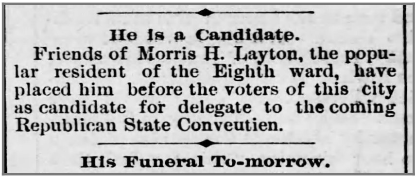 Family Members: Father: Major Layton. Mother: Rebecca (Steven) Layton. Siblings: Mary E. Layton, Anna Layton, Mrs. Warren Jackson, Norbert P. Layton, William H. Layton, Leon Layton, Florence Layton. Wife: M1: Ella (Marshall) Layton, m. 1887, d. 1906. Wife: M2: Margaret (Matthews) Layton, m. 1911. Wife: M3: Letitia B. Layton, m. 1921, divorced 1927. Father-in-Law: Eby Marshall. Mother-in-Law: Harriet Marshall. Children: Morris H. Layton, Jr., Ira L. Layton, Marshall Layton, Harriet “Hattie” R. (Layton) McFadden. Daughter-in-Law: Olive N. Layton.