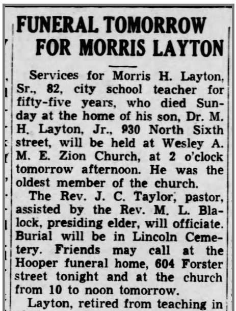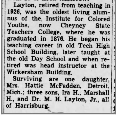 My Legacy: I taught and influenced two generations of students over the course of 50 years. My students became leaders in the Harrisburg community. I had four children, including Dr. Morris H. Layton, Jr., who worked for the betterment of their communities.