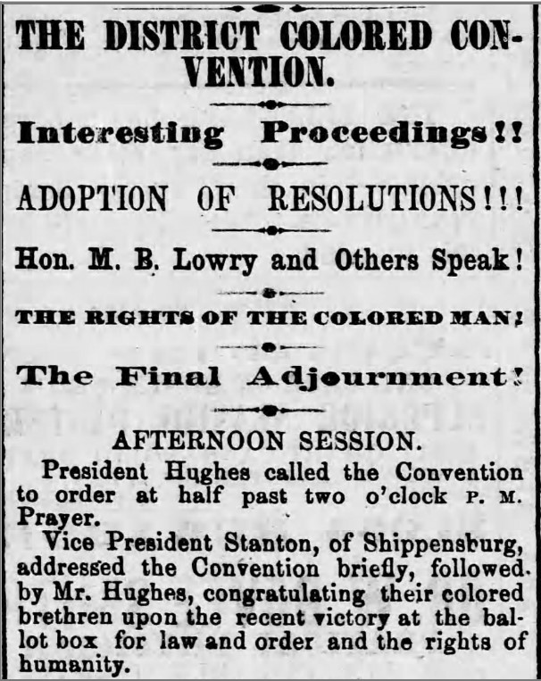 About Me: Mr. Hughes congratulated the Colored Convention “upon the recent victory at the ballot box for law and order and the rights of humanity.” — Harrisburg Telegraph, November 14, 1868.
