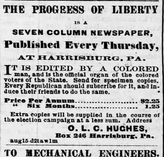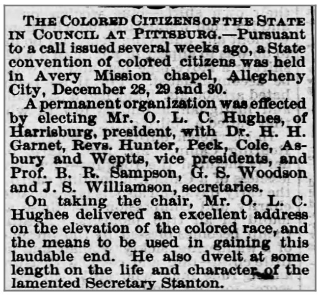 “Mr. O. L. C. Hughes then delivered an excellent address on ‘The Elevation of the Colored Race, and the means to be used in gaining this laudable end.’” — On O. L. C. Hughes’ involvement in the 1869 Colored Convention in Pittsburgh, Pittsburgh Daily Commercial, December 29, 1869.